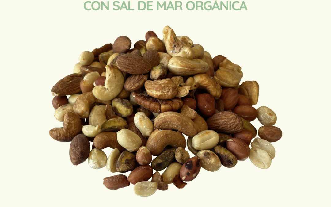 Selección de nuez de la india tostada, almendras tostadas, nuez pecana, y cacahuate tatemado con sal de mar orgánica.